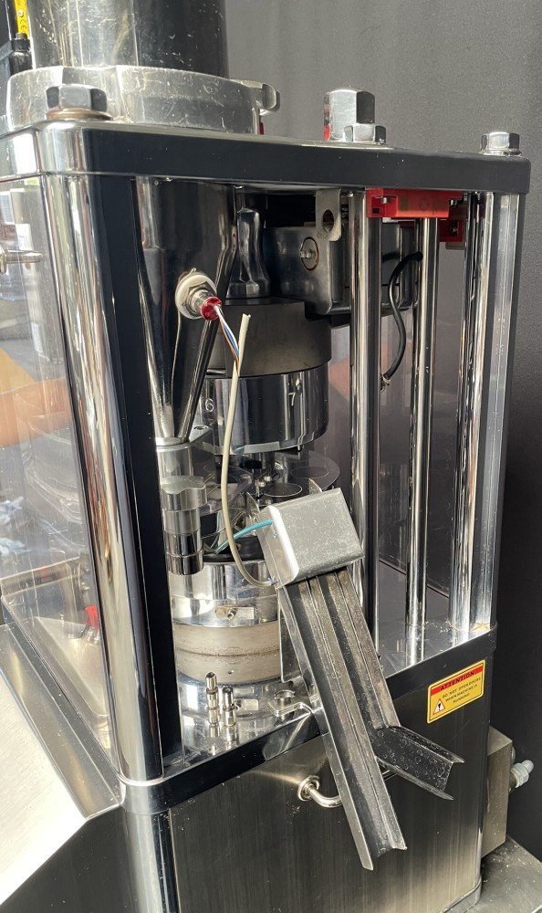 Diese Tablettenpresse ist zur Herstellung von Tabletten mit einem max. Durchmesser von 22 mm und einer Leistung von max. 24.000 konzipiert. Die Werkzeugaufnahme ist für geführtes Werkzeug EURO-NORM Typ D Matritzen Ø 38,1 mm ausgelegt.