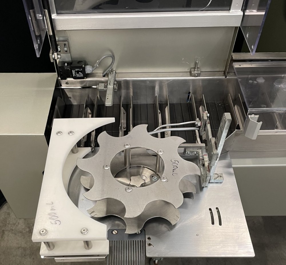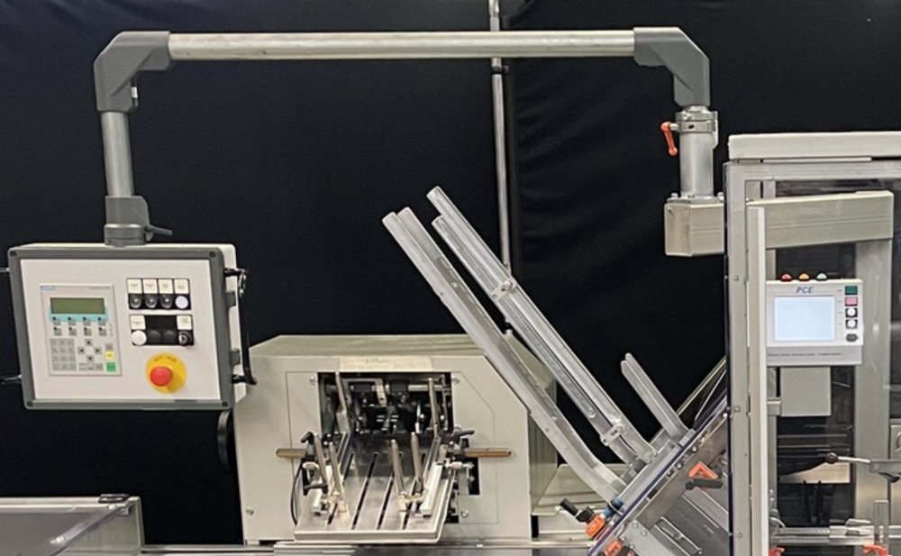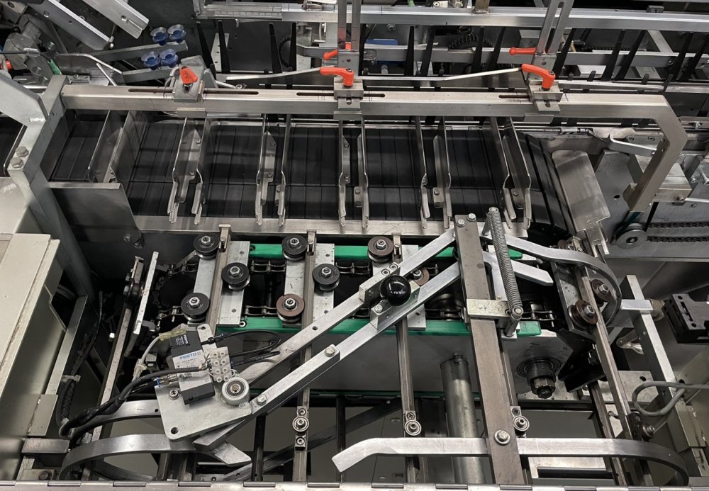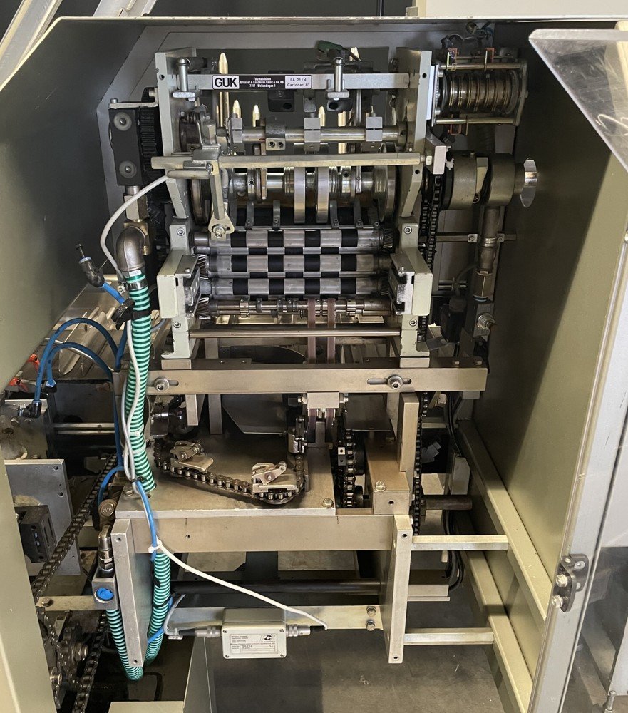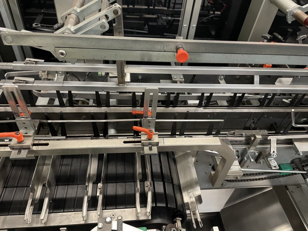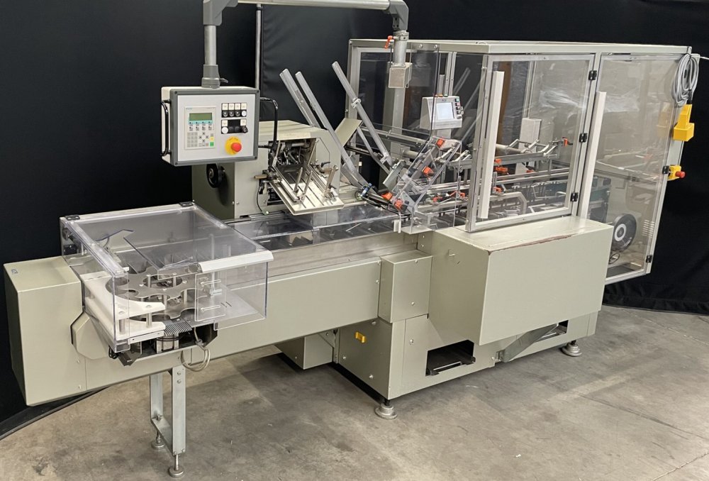 Diese vollautomatische und kontinuierlich arbeitende Kartoniermaschine zum Verpacken von Flaschen und gleichzeitiger Zuführung von Beipackzetteln in Faltschachteln mit einem max. Leistungsbereich von ca. 100 Faltschachteln / Min.