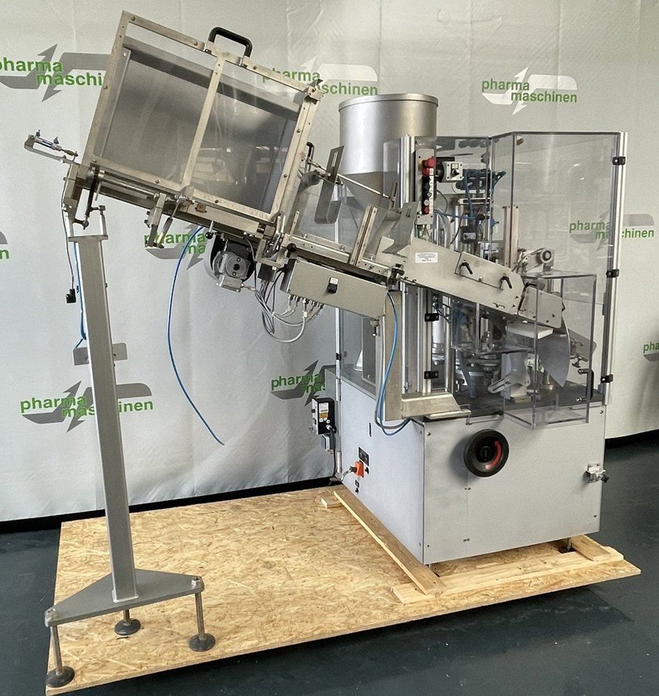 Der Vorbesitzer hat die Maschine zusätzlich zur Verarbeitung von Kunststoff-Kartuschen Ø 49 mm nachgerüstet. Eine Sortieremse, Zuführung, eine Eindrückstation für Kolbenböden Ø 46 mm sowie Tubenhalter für Kunststofftuben Ø 35 mm sind im Lieferumfang enthalten.