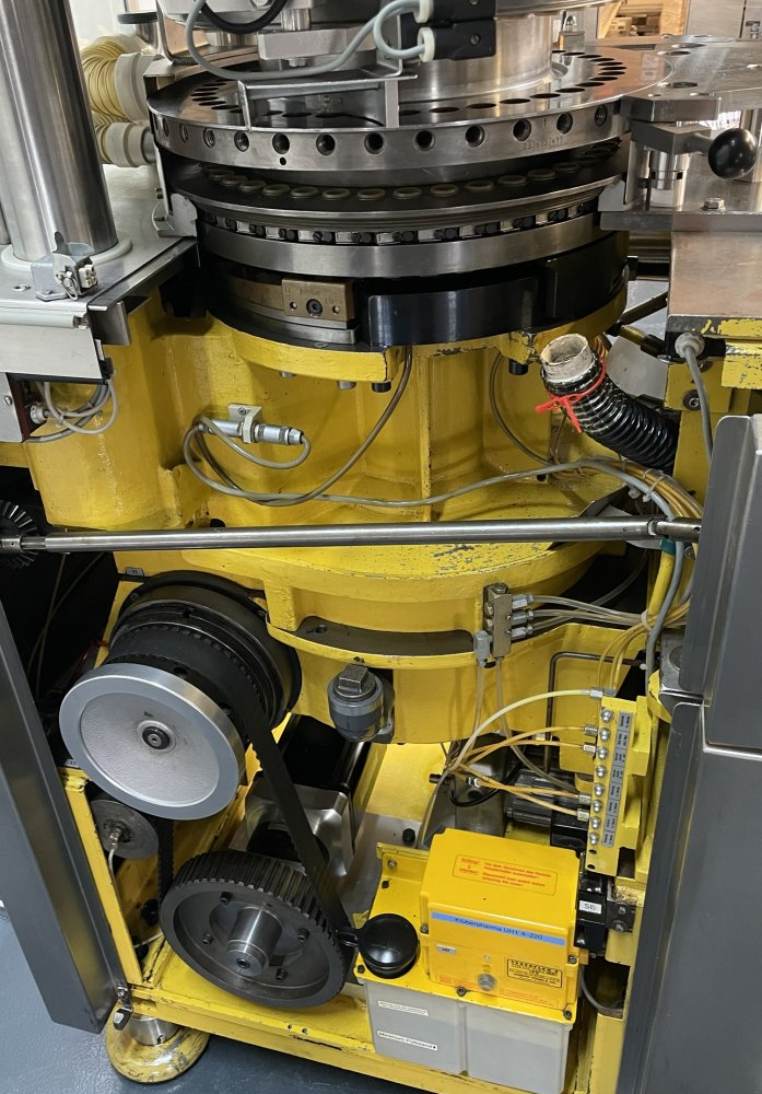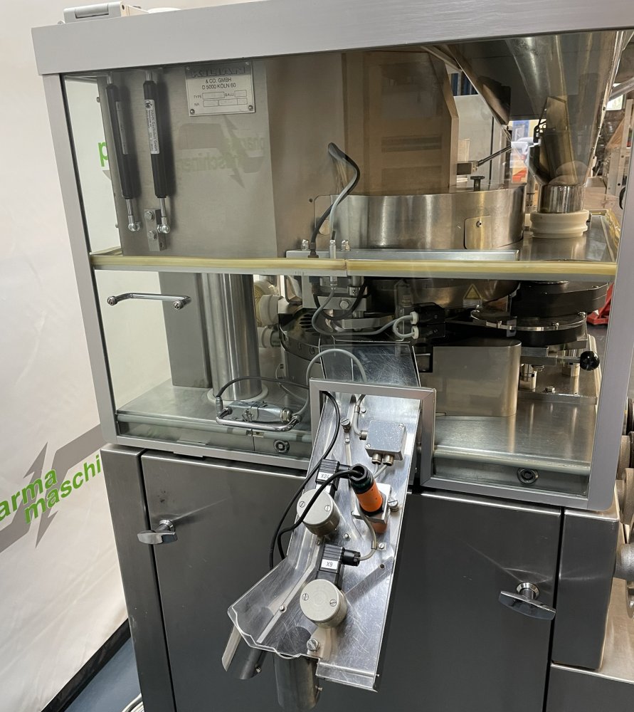 Diese Tablettenpresse ist zur Herstellung von Tabletten mit einem max. Durchmesser von 13 mm und einer max. Leistung von ca. 250.000 Tabletten/h ausgelegt - die Werkzeugaufnahme ist für EURO-NORM Typ BB eingerichtet. Zum Lieferumfang gehört ein Kilian Bedien-Kontroll- und Regelsystem.