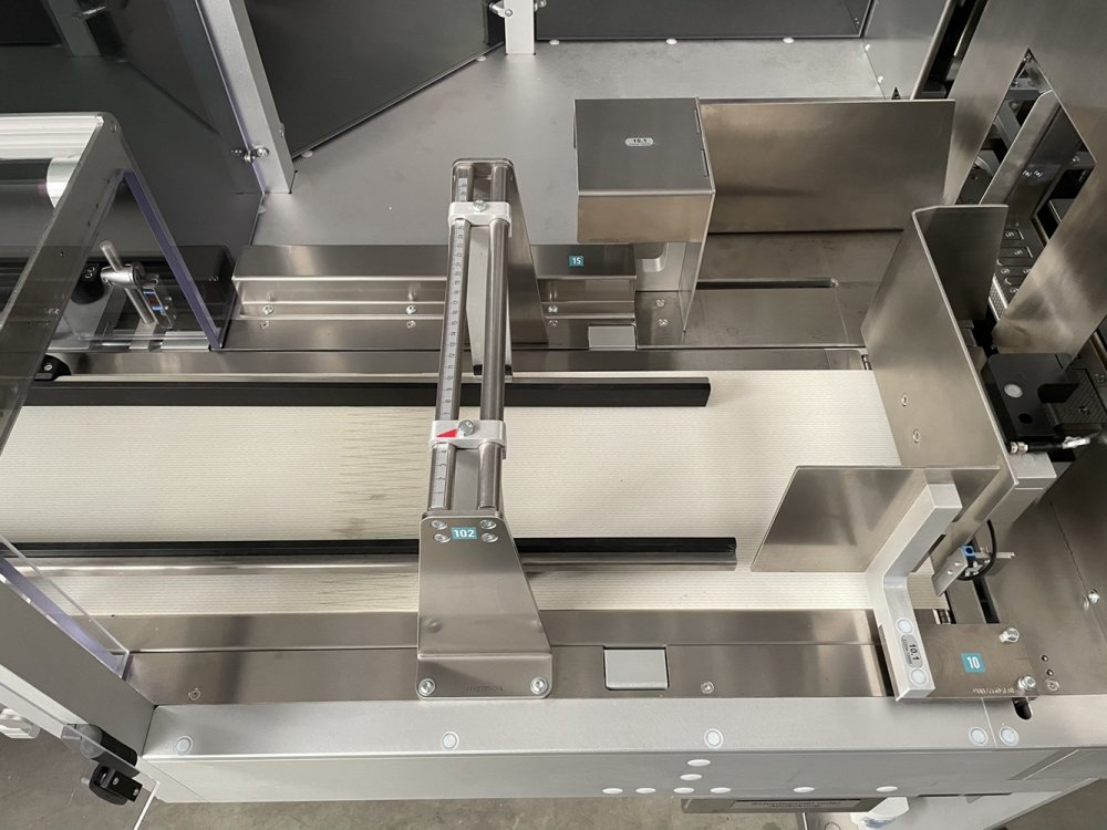This secondary packaging line consists of the PewoFold 2 full-wrap machine and the Pewo Collect grouping machine (semi-automatic). The line is configured for the packaging dimensions 156 x 205 x 156 mm.