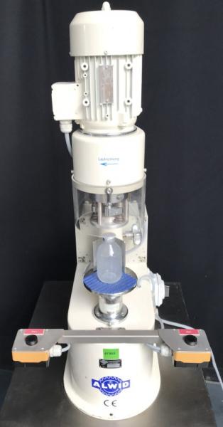 This semi-automatic benchtop device is designed for closing and flanging vials with aluminum caps.