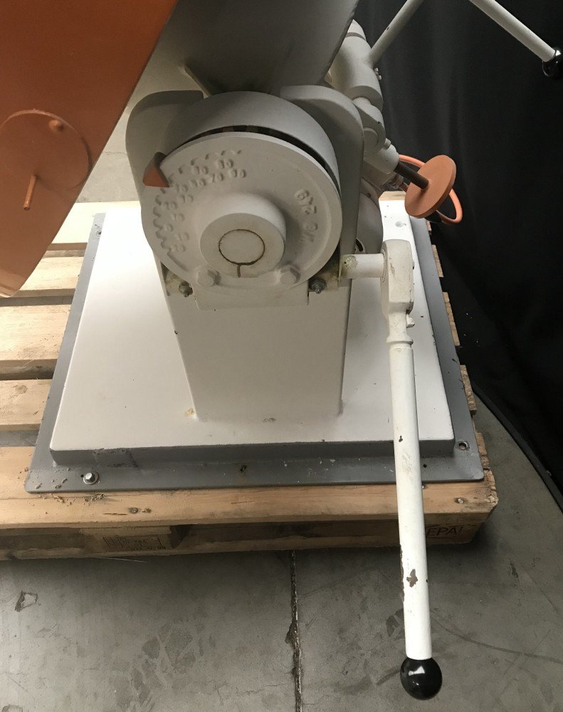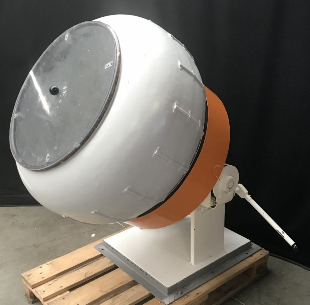 Esta caldera para hacer grageas de acero inoxidable está diseñada para unos 50 kg de pastillas, grageas, etc. listos y tiene las siguientes dimensiones: Diámetro: 950 mm Profundidad: 580 mm Abertura: 640 mm El accionamiento se efectúa por un motor de 1,1 kW.