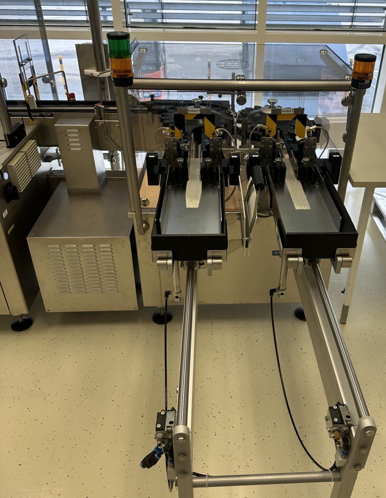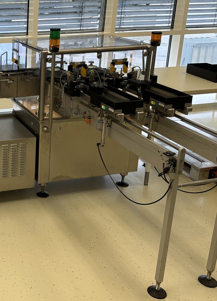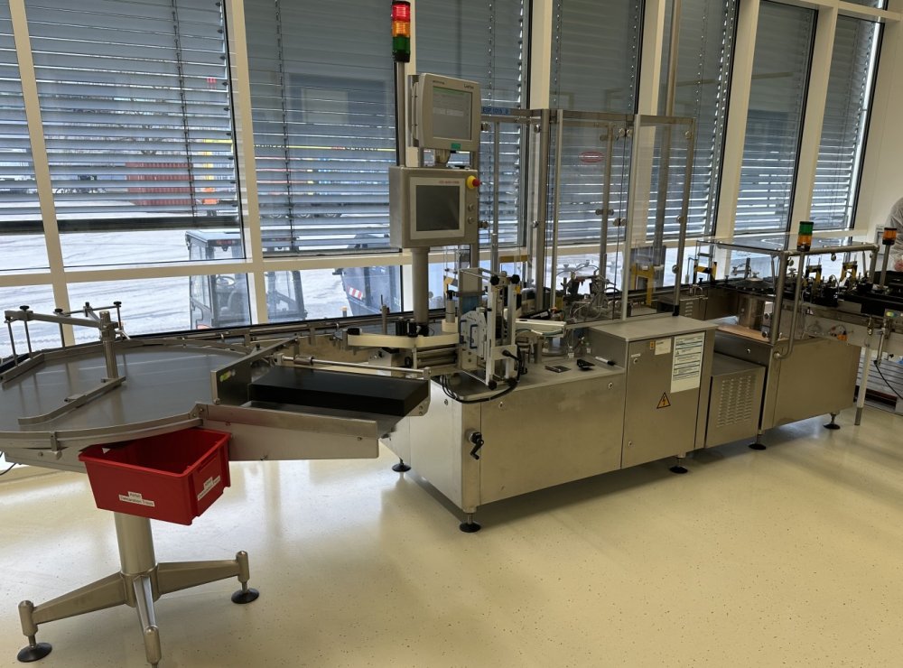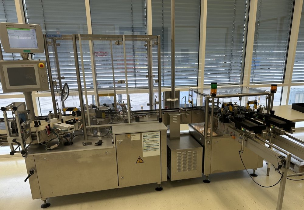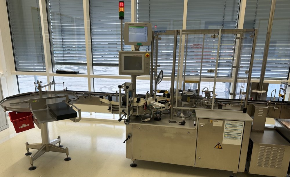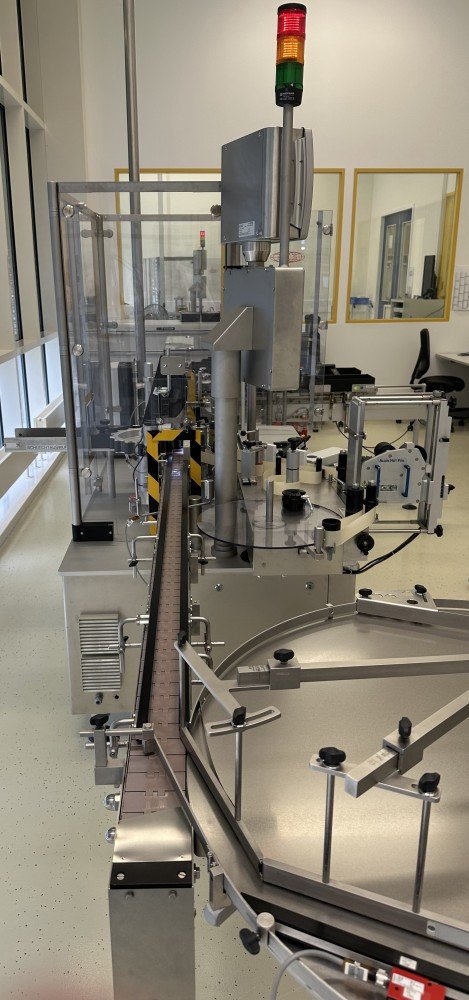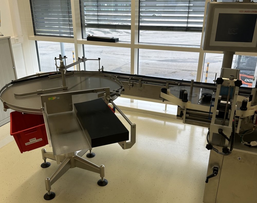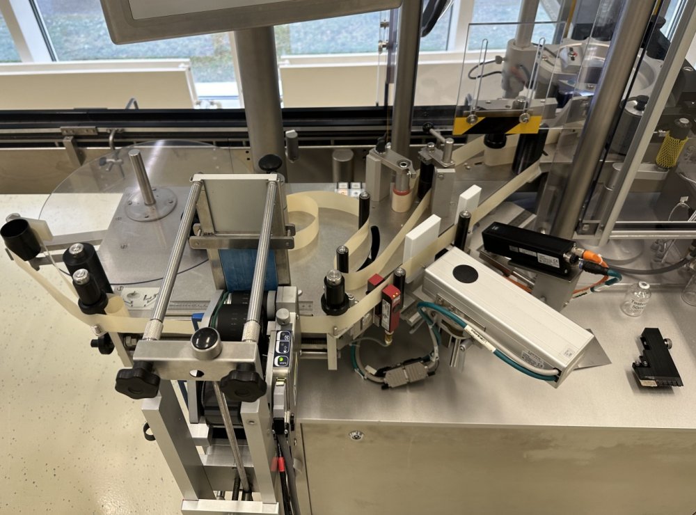 Esta máquina de alto rendimiento tiene una capacidad máx. de 18 000 objetos/h y está configurada para etiquetar viales y otros objetos cilíndricos. Datos técnicos: Ø objeto: 16 mm - 86 mm Altura del objeto: 35 mm - 240 mm Longitud de la etiqueta: 20 mm - 150 mm Altura de la etiqueta: 15 mm - 80 mm Se puede utilizar un modelo 50/30 de máquina de estampación en caliente Allen independiente para imprimir números de lote, etc.