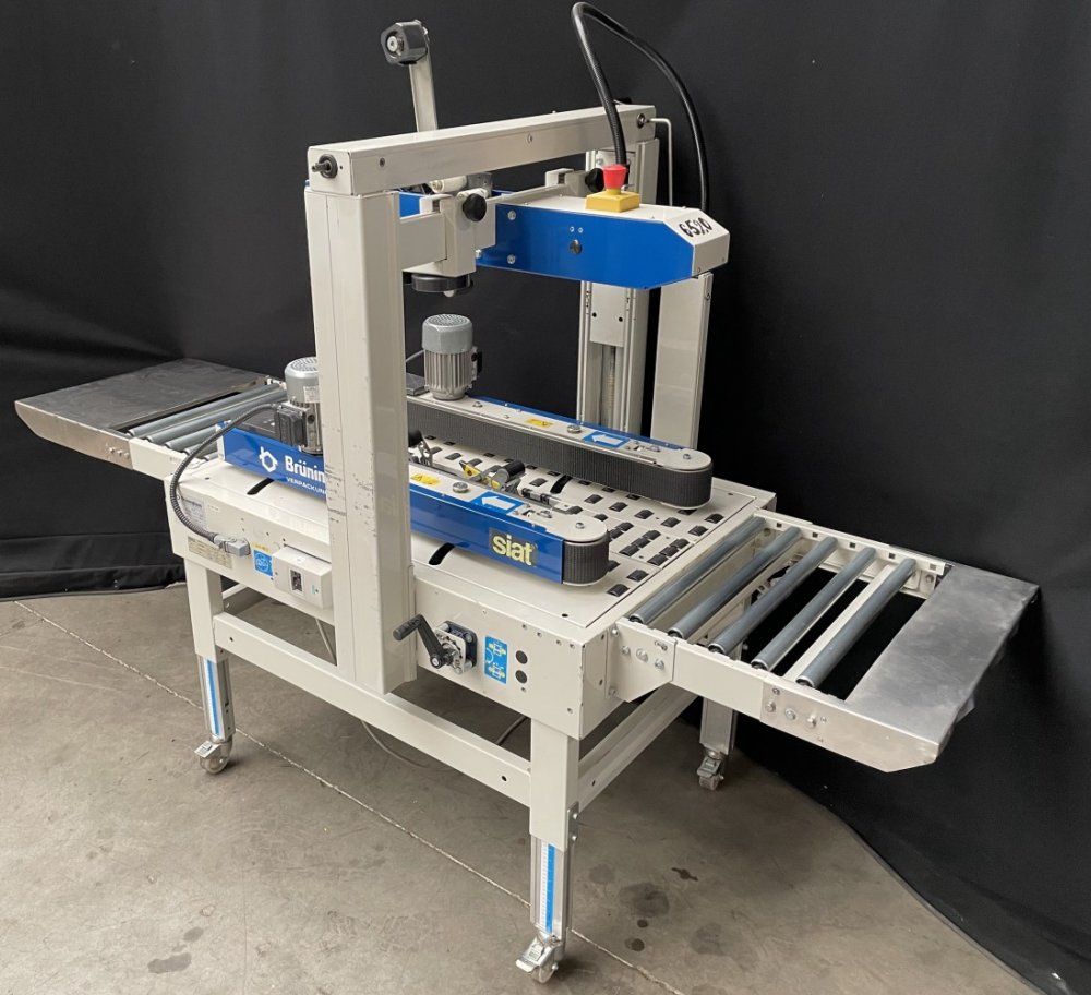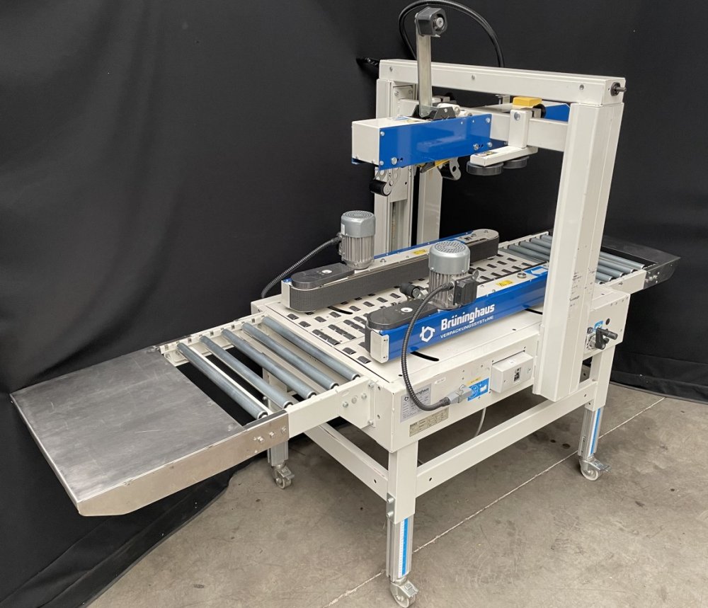 Máquina automática de cierre de cajas con ajuste manual Rendimiento: aprox. 800 cajas/h Cierra cajas plegables con cinta autoadhesiva Adecuada para series de cajas estándar del mismo tamaño