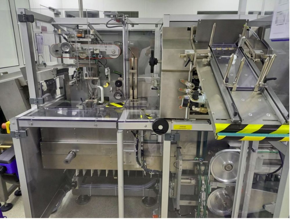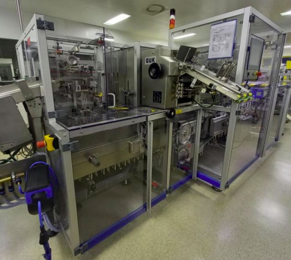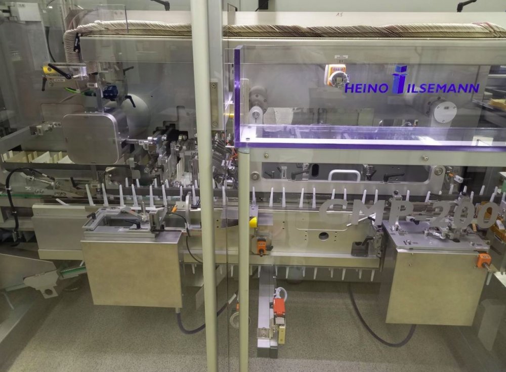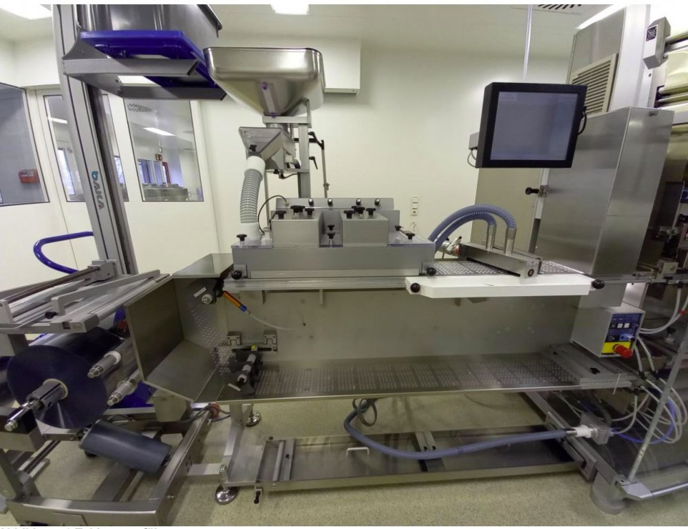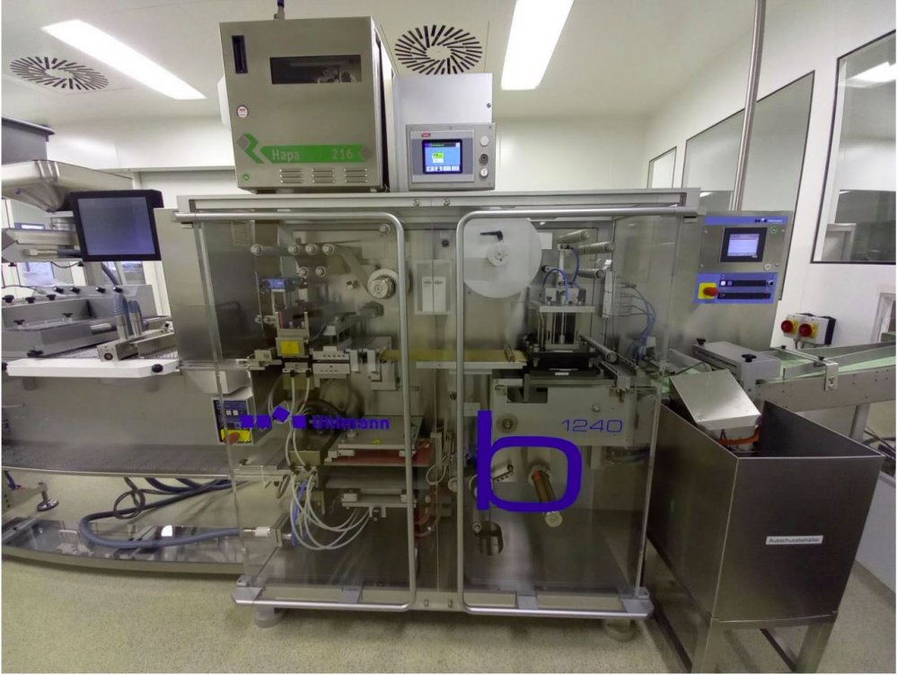 Esta línea está diseñada para la fabricación automática y para el llenado de tiras de blísteres con pastillas o grageas. para envasadora de blísteres Uhlmann B 1240 para blísteres de PVC/aluminio (año de fabricación 2005): Máx. 70 ciclos y 240 blísteres/min., ajustable de forma continua SimTap 2i: posicionador simultáneo de pastillas, año de fabricación: 2016 Cámara de control: Visiotec Visio Pan Aspiradora Nilfisk CTS 22, año de fabricación: 2013 Dispositivo de refrigeración KKT Kraus, año de fabricación: 2005 Impresora de film HAPA H216-I: anchura de film máx. 170 mm con imagen de impresión de 180 x 160 mm Datos técnicos: Superficie útil máx. del blíster: 130 x 156,5 mm Anchura de film máx.: 168 mm Profundidad de escudilla máx.: 24 mm Ø máx. rodillo de embutición profunda: 400 mm Ø máx. rodillo de film de recubrimiento: 240 mm Para máquina encartonadora Ilsemann CMP 200 con alimentación de blísteres (año de fabricación: 2015): Máx. 200 ciclos/min. (información del fabricante) Dispositivo alimentador y plegador de prospectos GUK Impresora Wolke m600 Se requiere aire comprimido externo. Disponible a partir de febrero de 2025.