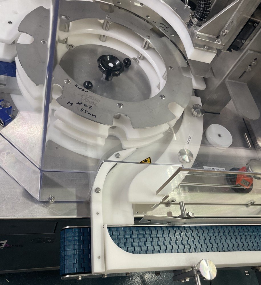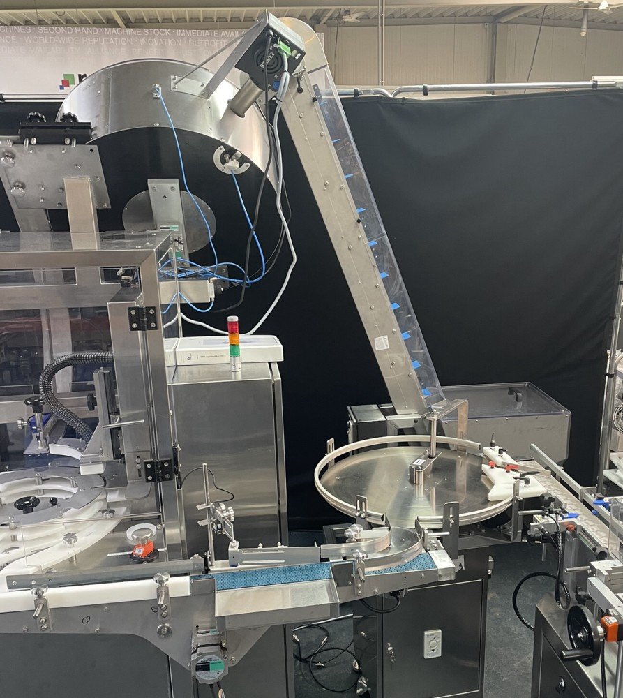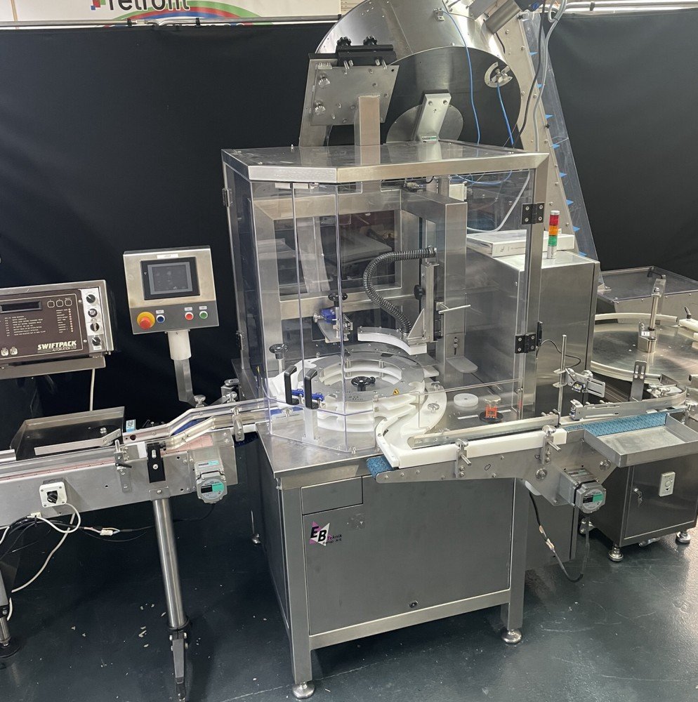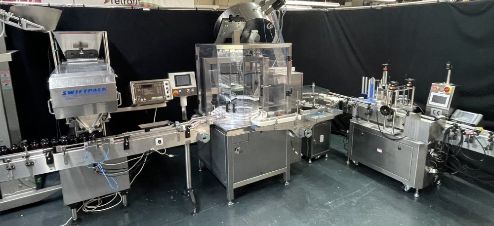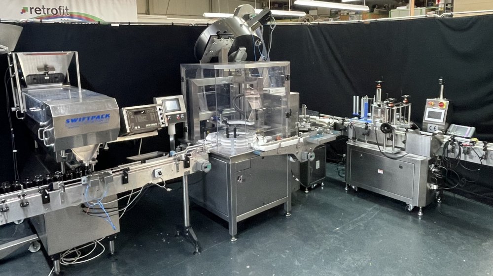 Línea de recuento, llenado, cierre y etiquetado para pastillas o cápsulas en latas o frascos. La línea se compone de: IMA Swiftpack SPC 12 - Máquina de recuento y llenado Alimentador de pastillas con elevador CVC 1101C Dispositivo cerrador tapones de impacto EB Teknik EB-LP Alimentación de tapones con elevador EB Teknik EB Etiquetadora EB Teknik PE 200 El rendimiento de la línea es de 55 contenedores/min. Se incluyen diferentes formatos.