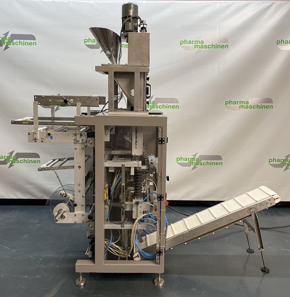 Esta máquina tiene una capacidad máxima de 65 sticks/min. y está diseñada para dar forma, llenar y sellar bolsas tubulares con polvo.