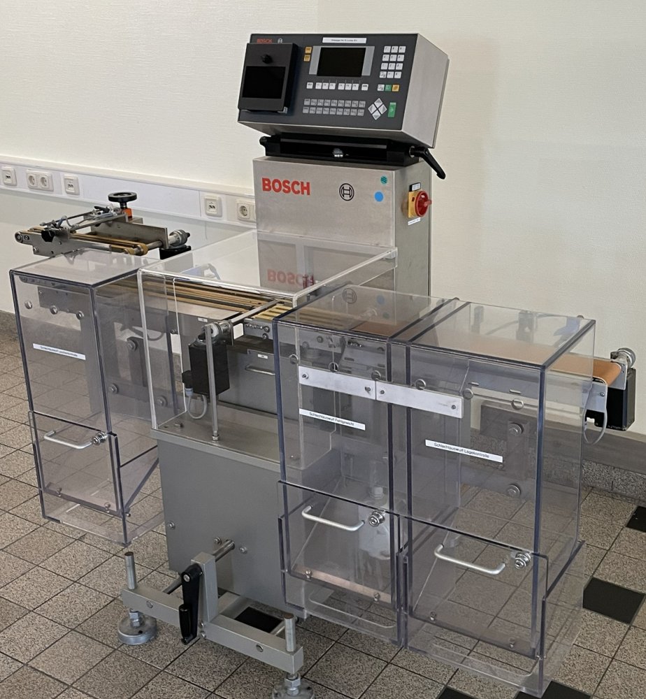 Esta báscula de control con un rendimiento de aprox. 150 envases/min (dependiendo del peso, el formato del envase y la velocidad de la cinta) está diseñada para controlar el peso predeterminado de cajas plegables ya embaladas.